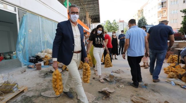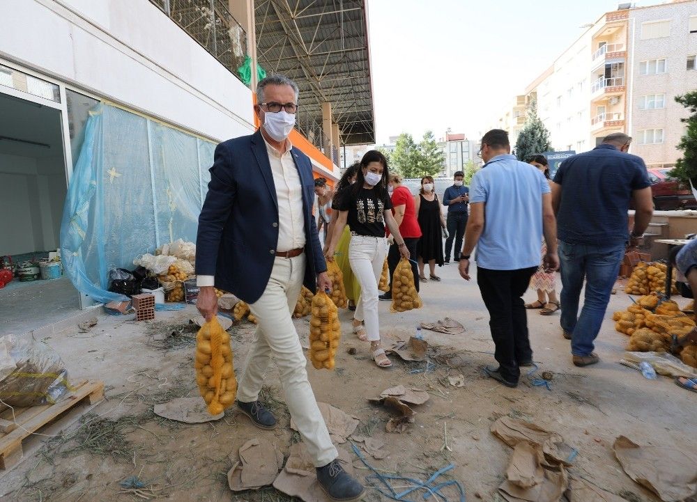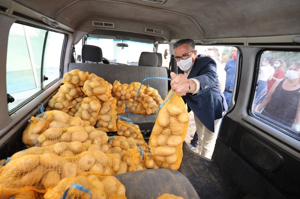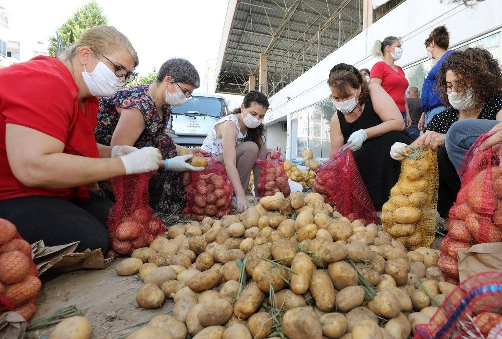 Gaziemir Belediye Başkanı Halil Arda ve belediyenin farklı birimlerinde çalışan ekipler, imece usulü gelen patatesleri 10'ar kilogramlık çuvallara doldurarak hızla ihtiyaç sahiplerine ulaştırılmasını sağladı.