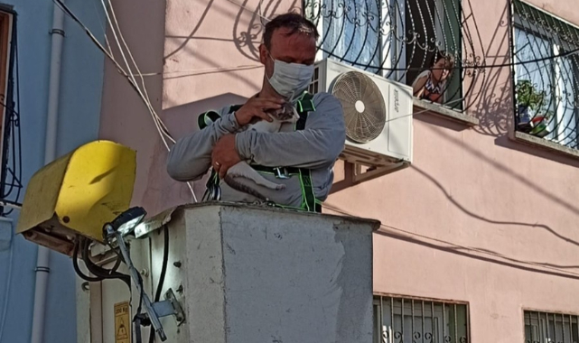İzmir'in konak ilçesinde gelen ihbar üzerine harekete geçen Gdz Elektrik ekipleri, gözleri görmeyen kediyi mahsur kaldığı elektrik direğinden kurtardı.