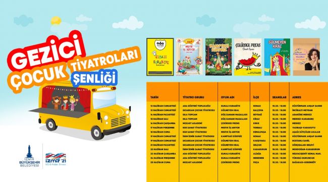 İzmir Büyükşehir Belediyesi çocukları on üç ilçede ücretsiz tiyatro oyunlarıyla buluşturacak. Gezici Çocuk Tiyatroları Şenliği 12 Haziran’dan 25 Haziran’a kadar devam edecek. Her oyun alanında palyaço ve yüz boyama etkinliğe de yapılacak. Konak, Balçova, Beydağ, Kiraz, Kınık, Torbalı, Kemalpaşa, Karşıyaka, Selçuk, Karaburun, Aliağa, Menemen, Foça’yı ziyaret edecek Gezici Sanat Kamyonu’nda “Elmalı Kurabiye”, “Mıstık İş Arıyor”, “Gülmeyen Kral”, “Çekirdek Prens”, “Düş Zamanı Masalları” ve “Kamptaki Sürpriz” adlı oyunlar 15.30 ve 18.00 saatleri arasında sahnelenecek.