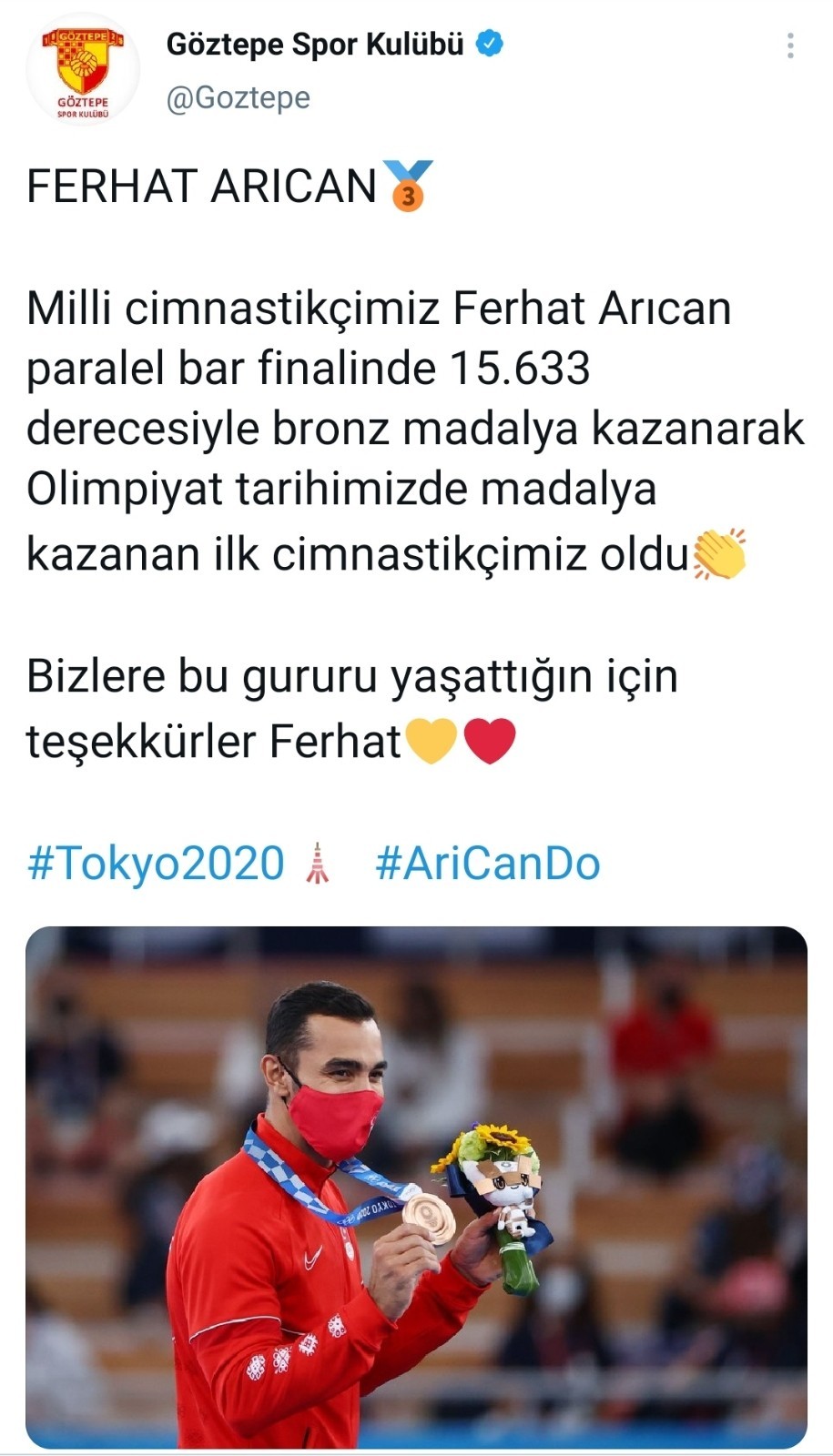 Milli cimnastikçi Ferhat Arıcan, 2020 Tokyo Olimpiyatları'nda Erkekler Artistik Cimnastik paralel bar final müsabakasında 15.633 puan alarak bronz madalya kazandı. Türkiye'nin cimnastik tarihinde ilk madalyasını kazanan Ferhat Arıcan'a bir tebrik de sporcusu olduğu Göztepe'den geldi.