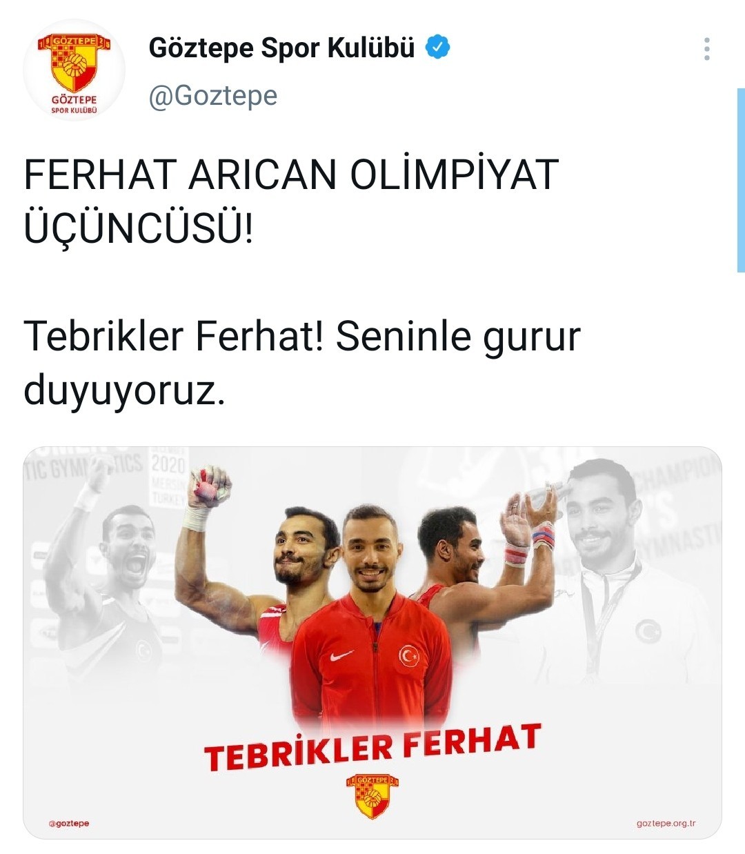 Göztepe Spor Kulübü, 2020 Tokyo Olimpiyatları'nda paralel barda bronz madalya kazanarak, Türkiye'ye cimnastikte tarihinin ilk madalyasını kazandıran sporcusu Ferhat Arıcan'ı yayınladığı mesajla tebrik etti.