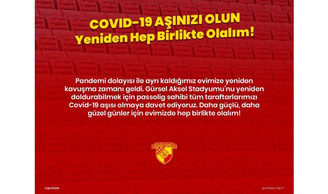 Göztepe, yeni sezonda sınırlı sayıda futbolseverle maçların oynanacağını hatırlatarak taraftarlarına aşı çağrısı yaptı. Sosyal medya hesaplarından, "Covid-19 Aşınızı Olun Yeniden Hep Birlikte Olalım" başlığıyla yapılan çağrıda, "Pandemi dolayısı ile ayrı kaldığımız evimize yeniden kavuşma zamanı geldi. Gürsel Aksel Stadyumunu yeniden doldurabilmek için Passolig sahibi tüm taraftarlarımızı Covid-19 aşısı olmaya davet ediyoruz. Daha güçlü, daha güzel günler için evimizde hep birlikte olalım" ifadelerine yer verildi.