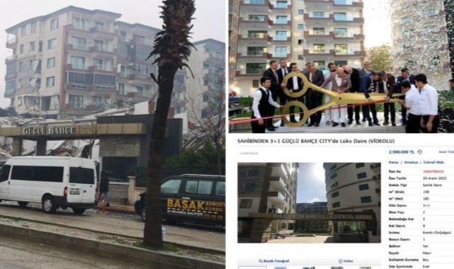 Kahramanmaraş merkezli depremde en çok can kaybının meydana geldiği şehirlerden biri olan Hatay'da enkaza dönüşen yapılardan biriyle ilgili dikkat çeken bir ayrıntı ortaya çıktı. Çok sayıda binanın yıkıldığı Antakya ilçesinde 2019 yılında AKP'li Antakya Belediye Başkanı İzzettin Yılmaz'ın da katıldığı 'Güçlü Bahçe City' adlı konut sitesi, depremde yerle bir oldu.Sitenin enkazında arama kurtarma çalışmaları devam ediyor. Enkaz altında kaç kişinin bulunduğu ise bilinmiyor.'En büyük makas' rekoruyla reklam edildi, depremde yerle bir olduAçılışla ilgili o dönem ajanslara yansıyan habere göre, Hatay'da faaliyet yürüten Ser-Al İnşaat firmasının sahibi Servet Altaş, şu ifadeleri kullanmış:"Güçlü Bahçe City projesini memleketimize istihdam kazandırmak için yapıyı bu aşamaya getirdik. Katılım ve açılışını bugün yaptık. Guinness Rekorlar Kitabına kazandırmak için kendi ölçümlerimizle yaptığımız 320 santimetre olan altın makasımızı yaptık. Başvurumuzu da yaptık. Bu rekoru da şehrimize kazandırdığımız için mutluyuz. Projemizi de şehrimize kazandırdığımız için mutluyuz. Bu makas daha öncesinde Hindistan'daydı. Adana'da Tekbaş İnşaat önceki süreçte bu rekoru almıştı. Biz bu rekoru Hatay'a getirdik."Açılışta Hatay'daki tüm mülki amirler vardıHaberde, sitenin açılışı için yapılan törene Hatay Büyükşehir Belediyesi Başkanı Lütfü Savaş, Hatay Vali Yardımcısı Aydın Tetikoğlu, AKP Hatay Milletvekili Sabahat Özgürsoy Çelik, Yayladağı Belediyesi Başkanı Mustafa Sayın, HASİAD Başkanı Gökhan Alkan, Hatay Beşiktaşlılar Derneği Başkanı Mehmet Yıldız, Antakya Ticaret ve Sanayi Odası Başkanı Hikmet Çinçin, STK temsilcileri ve iş insanlarının katıldığı belirtiliyor. 'Lüks daire' ilanı kaldırıldıDeprem sonrası yıkılan Güçlü Bahçe Sitesi'ndeki bir daire için bir internet sitesinde verilen satış ilanı da sosyal medyada gündem oldu.2 milyon 900 bin liraya satışa çıkarılan "lüks daire"nin ilanı daha sonra kaldırıldı.