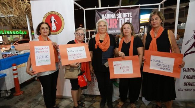 Çocuğunun gözleri önünde öldürülen Emine Bulut ve şiddete kurban giden tüm kadınlar adına konuşma yapan Cumhuriyet Kadınlar Derneği Güzelbahçe Şubesi Başkanı Mesude Öney, “ çocuğunun gözleri önünde ölmek istemediğini haykırarak ölüme giden Emine Bulut’un uğradığı zulmü lanetliyoruz. Kadınların uğradığı şiddet, taciz, tecavüz ve ölüm haberleri yazılı ve görsel medyada her gün yerini alıyor. Yetkili kurumlar açıklama yapıyor ve kadınların ‘ölmek istemiyorum’ haykırışları kulaklarımızda çığlık, vicdanlarımızda yaralar açarak yeni bir habere yer açmak için gerilere itiliyor. Kadınların şiddete uğraması bu şiddetin devamında çocuklarının yakınlarının önünde paramparça olmaları bir sonuçtur. İçinde yaşadığımız ekonomik, siyasal ve kültürel bütünün kadınlara sunduğu bir sonuç. Başka Emine Bulut olayları yaşanmaması için üzerimize düşen görevleri yapmak. Başı darda olan kadınlarımıza destek olmak, sorunlarını birlikte göğüslemek için görev başında olacağız. Tüm yetkilileri de kadını ikinci sınıf sayan eşitsiz, yazısız yasalarla mücadelede sorumluluklarını yerine getirmeye davet ediyoruz” dedi.
