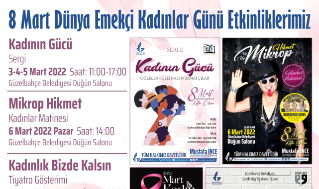 8 Mart Dünya Emekçi Kadınlar Günü Güzelbahçe’de bir dizi etkinlikle kutlanacak. Güzelbahçe Belediyesi ve Güzelbahçe Kültür Sanat ve Musiki Derneği işbirliği ile 3-4-5 Mart Tarihlerinde Güzelbahçeli Kadın Sanatçılardan oluşan ‘Kadının Gücü Sergisi’ düzenlenecek. 6 Martta Mikrop Hikmet (Hikmet Durmuş) Kadınlar Matinesi etkinliği, 7 Martta Yılmaz Erdoğan’ın yazdığı Selin Akın Yardımoğlu’nun yönettiği ‘Kadınlık Bizde Kalsın’ Tiyatro gösterimi ve 8 Martta da ‘8 Mart 8 Kadın Konseri’ düzenlenecek.
