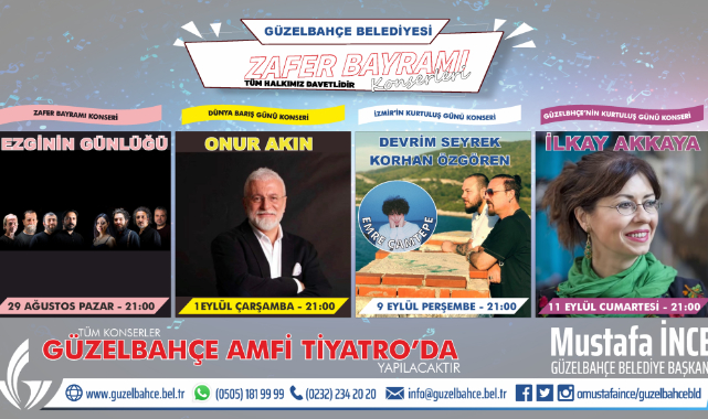 Pandemi kurallarına uygun olarak yapılacak 30 Ağustos zafer bayramı Kutlamaları güzelbahçe belediyesi Amfi Tiyatrosunda yapılacak. 29 Ağustos’ta Ezginin Günlüğü, 1 Eylül de Onur Akın, 9 Eylülde Devrim Seyrek, Korhan Özgören, Emre Çamtepe, 11 Eylülde İlkay Akkaya ile konserler son bulacak.