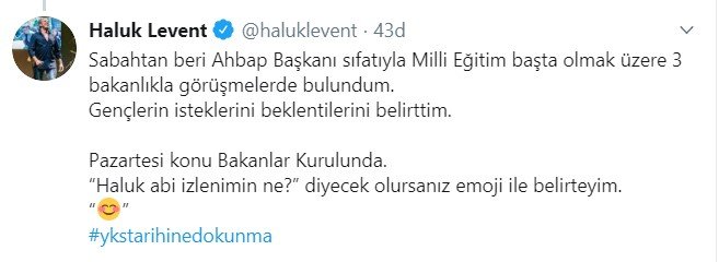 AHBAP’ın kurucusu Haluk Levent, öğrencilerin Yüksek Öğretim Kurumları Sınavı’nın (YKS) erkene alınmaması talebi ile ilgili Milli Eğitim Bakanlığı ile görüşme gerçekleştirdiğini açıkladı.İZLENİMİ OLUMLUKonuyla ilgili sosyal medyadan bir açıklama yapan Levent, “Sabahtan beri ahbap Başkanı sıfatıyla Milli Eğitim başta olmak üzere 3 bakanlıkla görüşmelerde bulundum. Gençlerin isteklerini beklentilerini belirttim.Pazartesi konu Bakanlar Kurulu’nda. ‘Haluk abi izlenimin ne?’ diyecek olursanız emoji ile belirteyim: :)