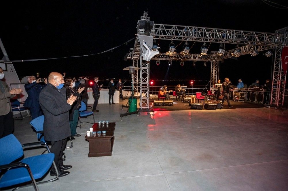 Sosyal mesafe kuralı gereği Levent, konsere orkestrayla değil üç müzisyenle çıktı. Ses ve ışık sistemiyle donatılmış feribot aynı zamanda Körfez'de büyük bir görsel şölen de oluşturdu. Levent'e feribotta İzmir Büyükşehir Belediye Başkanı Tunç Soyer ve eşi Neptün Soyer de eşlik etti.