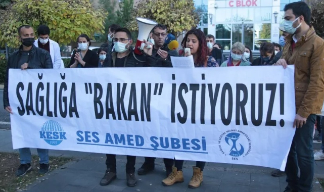 Kadın Doğum Hastanesi önünde yapılan açıklamada konuşan Sağlık ve Sosyal Hizmet Emekçileri Sendikası (SES) Diyarbakır Şube Eşbaşkanı Şiyar Güldiken, sağlık çalışanlarının pandemi süreciyle başlayan çalışma koşullarının gün geçtikçe daha da ağırlaştığına işaret etti.