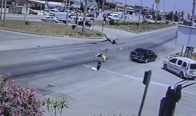 Hatay’ın Antakya ilçesinde otomobil ile motosikletin çarpıştığı kazada 1 kişi hayatını kaybederken, 2 kişi de yaralandı. Kazada motosiklet üzerinde bulunan 2 şahsın metrelerce havaya uçtuğu anlar güvenlik kamerasına yansıdı.