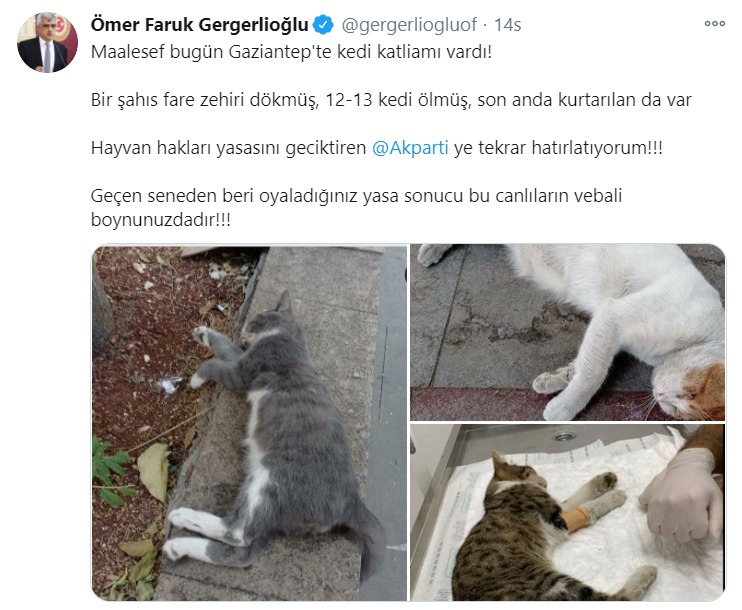 Sosyal medya hesabı Twitter'dan açıklama yapan Gergerlioğlu, "Maalesef bugün Gaziantep’te kedi katliamı vardı! Bir şahıs fare zehiri dökmüş, 12-13 kedi ölmüş, son anda kurtarılan da var" dedi.