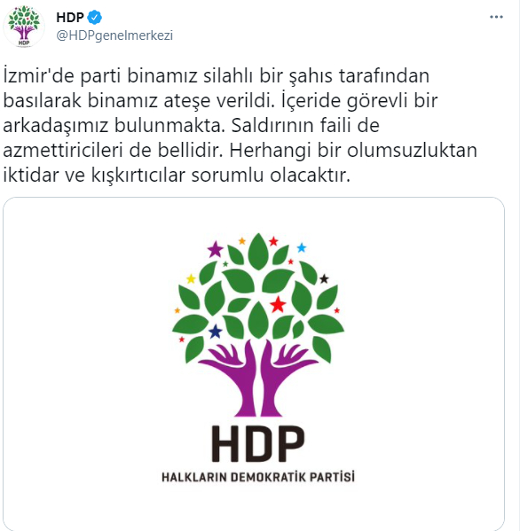 "İzmir'de parti binamız silahlı bir şahıs tarafından basılarak binamız ateşe verildi. İçeride görevli bir arkadaşımız bulunmakta. Saldırının faili de azmettiricileri de bellidir. Herhangi bir olumsuzluktan iktidar ve kışkırtıcılar sorumlu olacaktır."