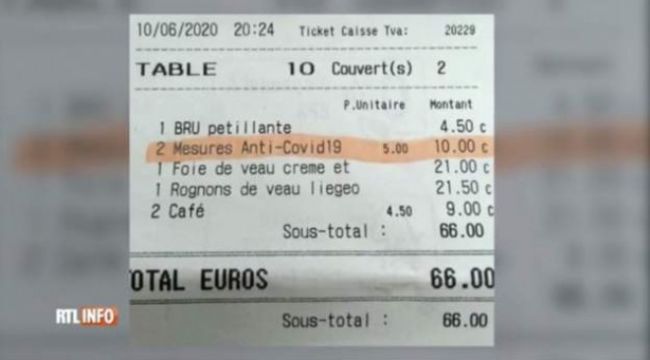 Brüksel'deki VIVA M'Boma adlı işletme, müşterilerden, yemek ücreti dışında fazladan alınan 5'er euroyu kasa fişlerinde, "Covid - 19 bedeli" olarak yansıtıyor.