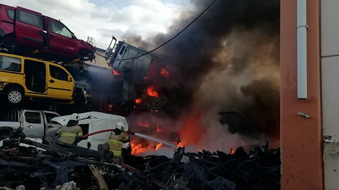 İzmir'in Kemalpaşa ilçesinde geri dönüşüm için bekletilen hurda araçların tutulduğu alanda çıkan yangın söndürüldü.