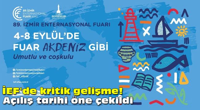 İzmir Büyükşehir Belediyesi ve ilgili kurumlarla yapılan son değerlendirmenin ardından 89. İzmir Enternasyonal Fuarı'nın (İEF) açılış tarihi öne alındı. Küresel salgının ardından İzmir'de açılacak ilk fuarın, 9 Eylül coşkusuyla birleşmesinin yaratabileceği yoğunluk göz önüne alınarak İEF 4-8 Eylül tarihlerine kaydırıldı. Fuar, pandemi önlemleri altında yapılacak.