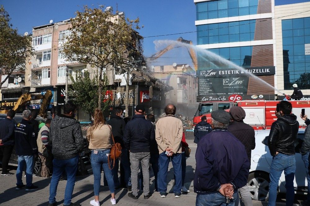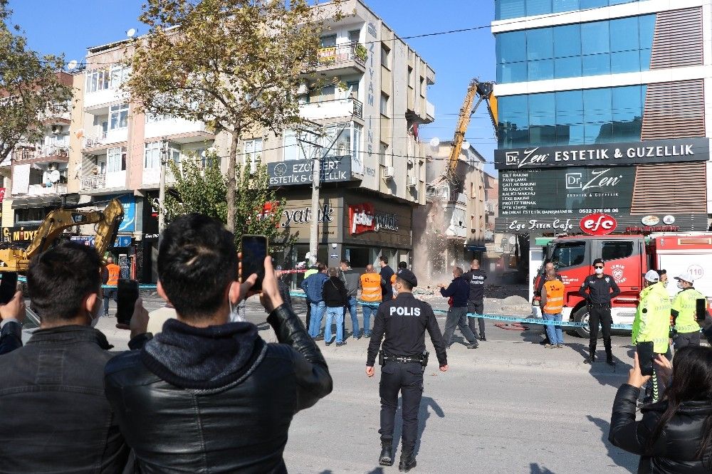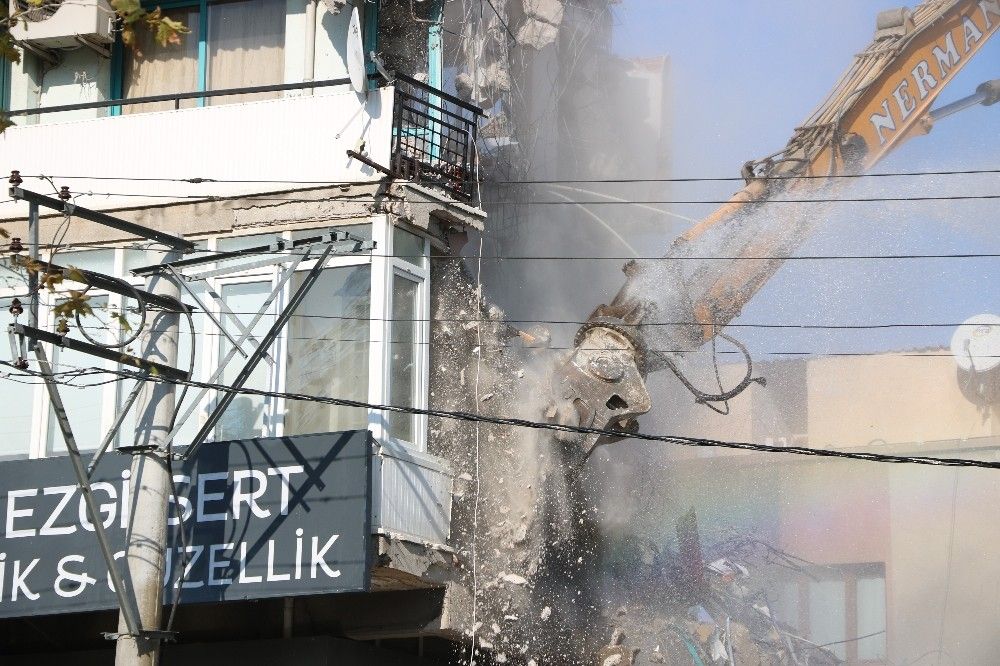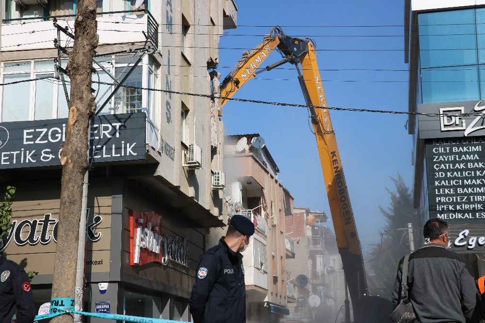 İzmir'in Seferihisar ilçesi açıklarında meydana gelen 6.6 şiddetindeki depremin ardından ağır hasarlı binaların yıkımına devam ediliyor. İzmir'in Bayraklı ilçesinde bulunan ve 34 kişiye mezar olan Rızabey Apartmanı karşısındaki hasarlı binaların yıkıma başlandı.