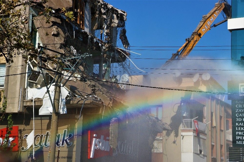 Öte yandan binanın yıkımı sırasında itfaiye ekipleri su tutarken oluşan gökkuşağı ise dikkat çekti.