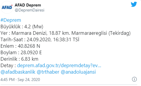 Deprem, Tekirdağ'a bağlı Marmaraereğlisi açıklarında meydana geldi. AFAD, depremin büyüklüğünün 4,2 olarak açıkladı.