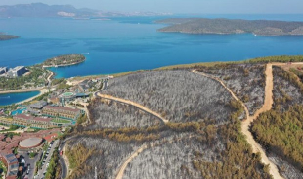 Muğla'nın Milas ilçesi Meşelik Mahallesi'nde dün çıkan ve rüzgarın da etkisiyle Bodrum'un Güvercinlik Mahallesi'ne sıçrayan orman yangını kontrol altına alındı. Havadan ve karadan soğutma çalışmalarının yapıldığı yangında, ilk belirlemelere göre 80 hektarlık alan zarar gördü. Muğla'nın Milas ilçesinde çıkan orman yangınında zarar gören ormanlık alan havadan görüntülendi.
