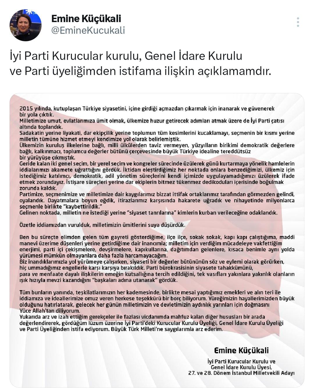 İYİ Parti Genel İdare Kurulu ve Kurucular üyesi Emine Küçükali, partisinden istifa ettiğini duyurdu.Sosyal medya üzerinden açıklama yapan Küçükali, "Para ve menfaate dayalı ilişkilerin emeğin kutsallığına tercih edildiğini, tek vasıfları yakınlara yakınlık olanların ışık hızıyla mevzi kazandığını 'başkaları adına utanarak' gördük" ifadelerini kullandı.Küçükali açıklamasında şunları kaydetti: