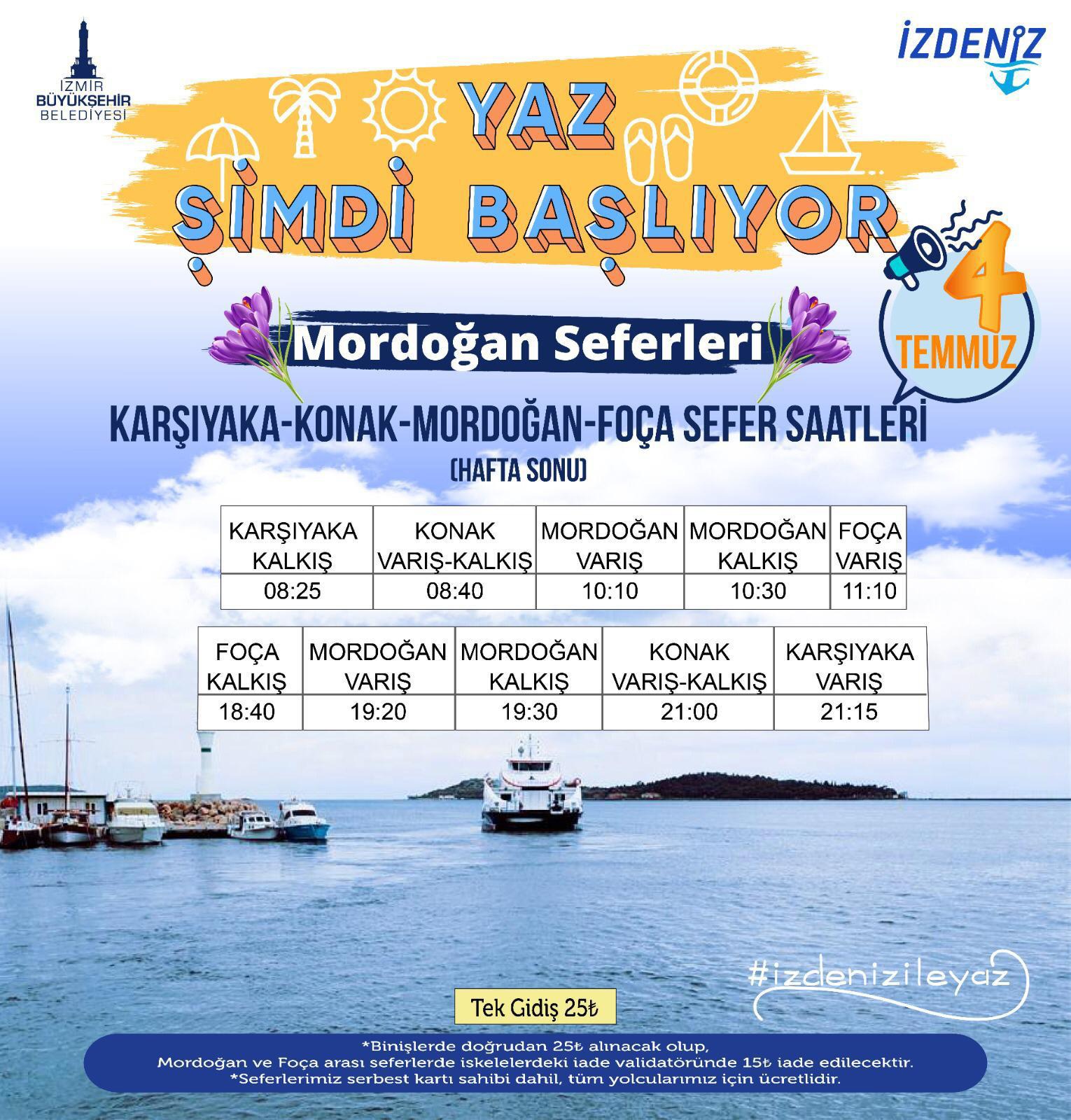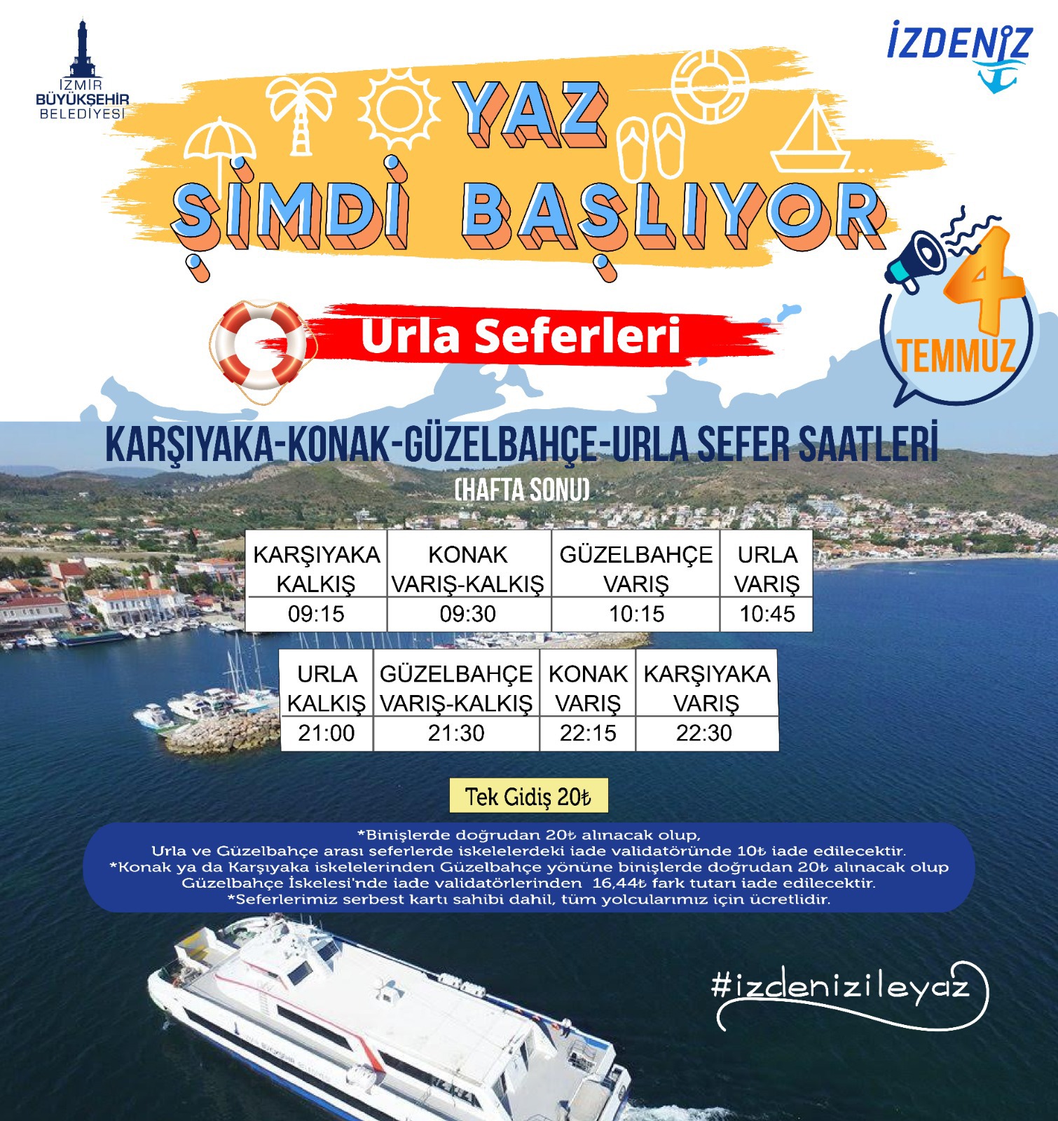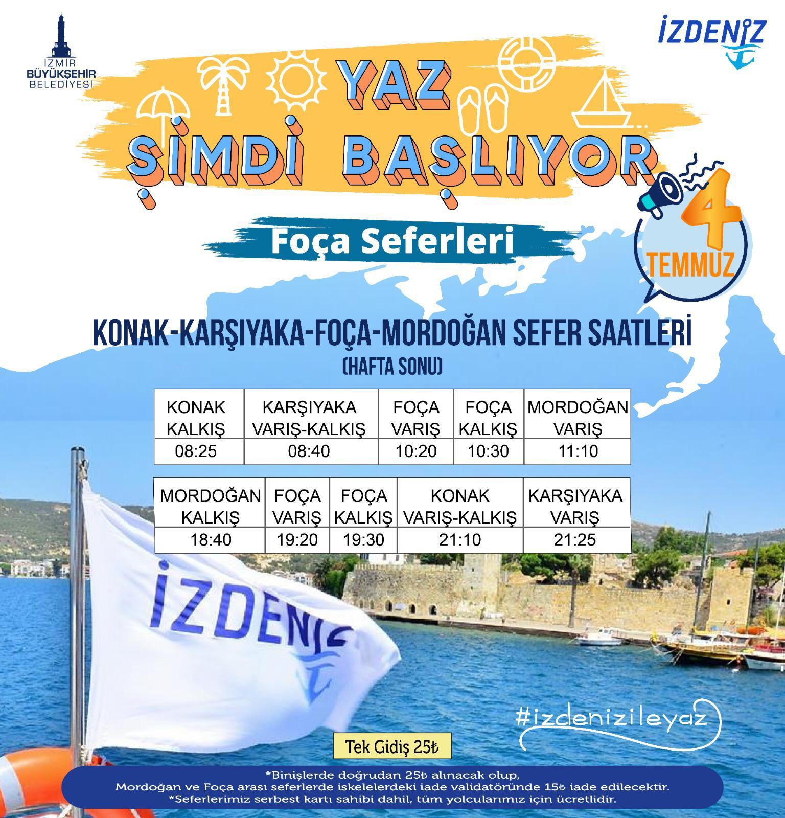 İzmir Büyükşehir Belediyesi İZDENİZ Genel Müdürlüğü’nün artık klasikleşen yaz seferleri, 4 Temmuz Cumartesi gününden itibaren başlayacak. Seferler, hafta sonları; Karşıyaka-Konak-Güzelbahçe-Urla; Karşıyaka-Konak-Mordoğan-Foça ve Konak-Karşıyaka-Foça-Mordoğan güzergâhlarında yapılacak.
