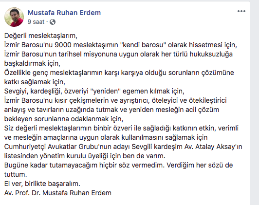 İZMİRGÜNDEMİ/ Sosyal Medya üzerinden yaptığı paylaşımlarla dikkat çeken Profesör Mustafa Ruhan ERDEM, dün gece yaptığı açıklamada; “İzmir Barosu’nu 9000 meslektaşımın “kendi barosu” olarak hissetmesi için, İzmir Barosu’nun tarihsel misyonuna uygun olarak her türlü hukuksuzluğa başkaldırmak için, sevgiyi, kardeşliği, özveriyi “yeniden” egemen kılmak için, İzmir Barosu’nu kısır çekişmelerin ve öteleyici ve ötekileştirici anlayış ve tavırların uzağında tutmak ve yeniden mesleğin acil çözüm bekleyen sorunlarına odaklanmak için, siz değerli meslektaşlarımın bin bir özveri ile sağladığı katkının etkin, verimli ve mesleğin amaçlarına uygun olarak kullanılasını sağlamak için sevgili kardeşim Av. Atalay Aksay’ın listesinden Cumhuriyetçi grubun yönetim kurulu üyeliği için ben de varım. Bugüne kadar tutamayacağım hiçbir söz vermedim. Verdiğim her sözü de tuttum. Vereceğiniz destek gücümüze güç katacak” dedi.