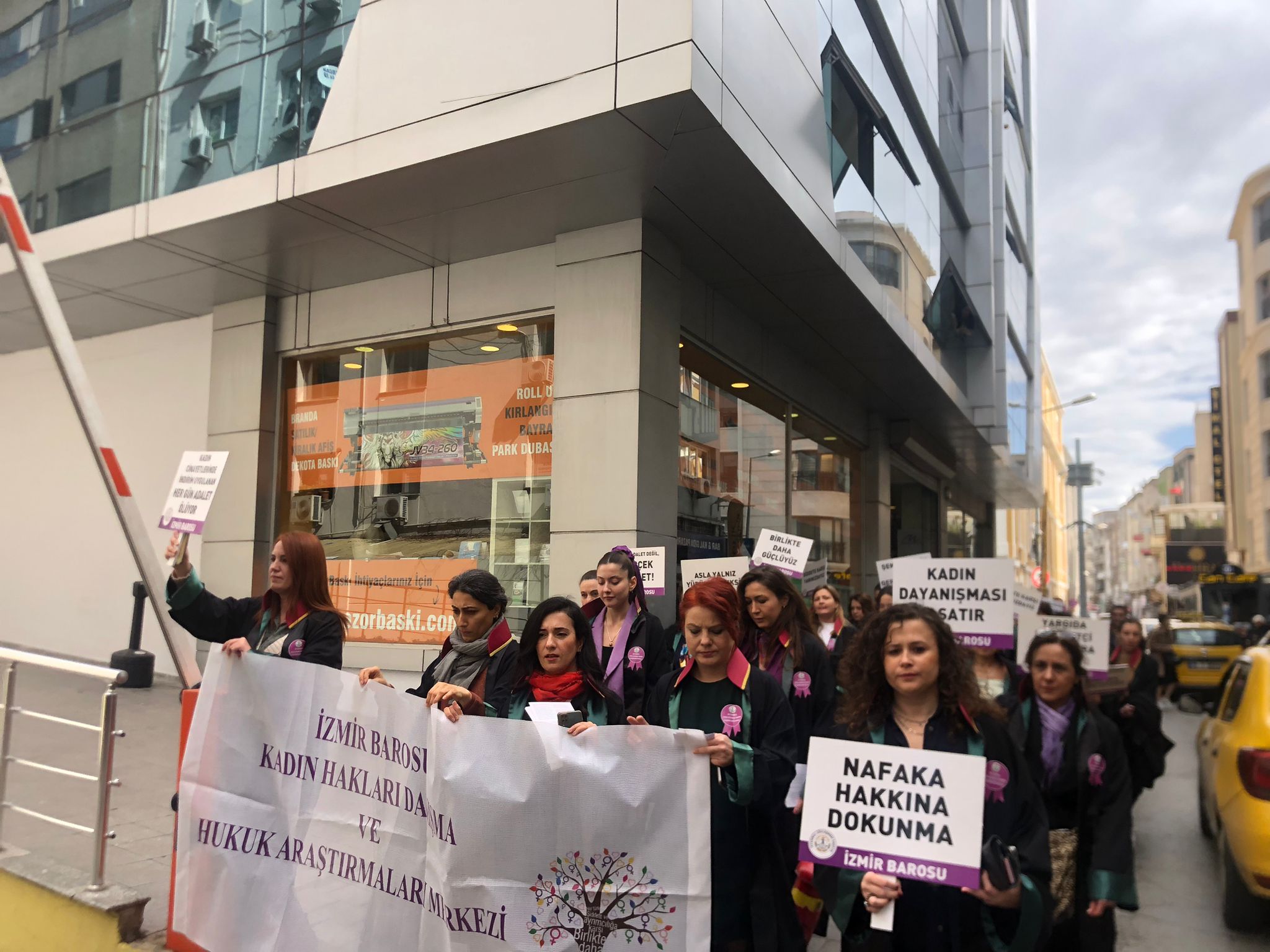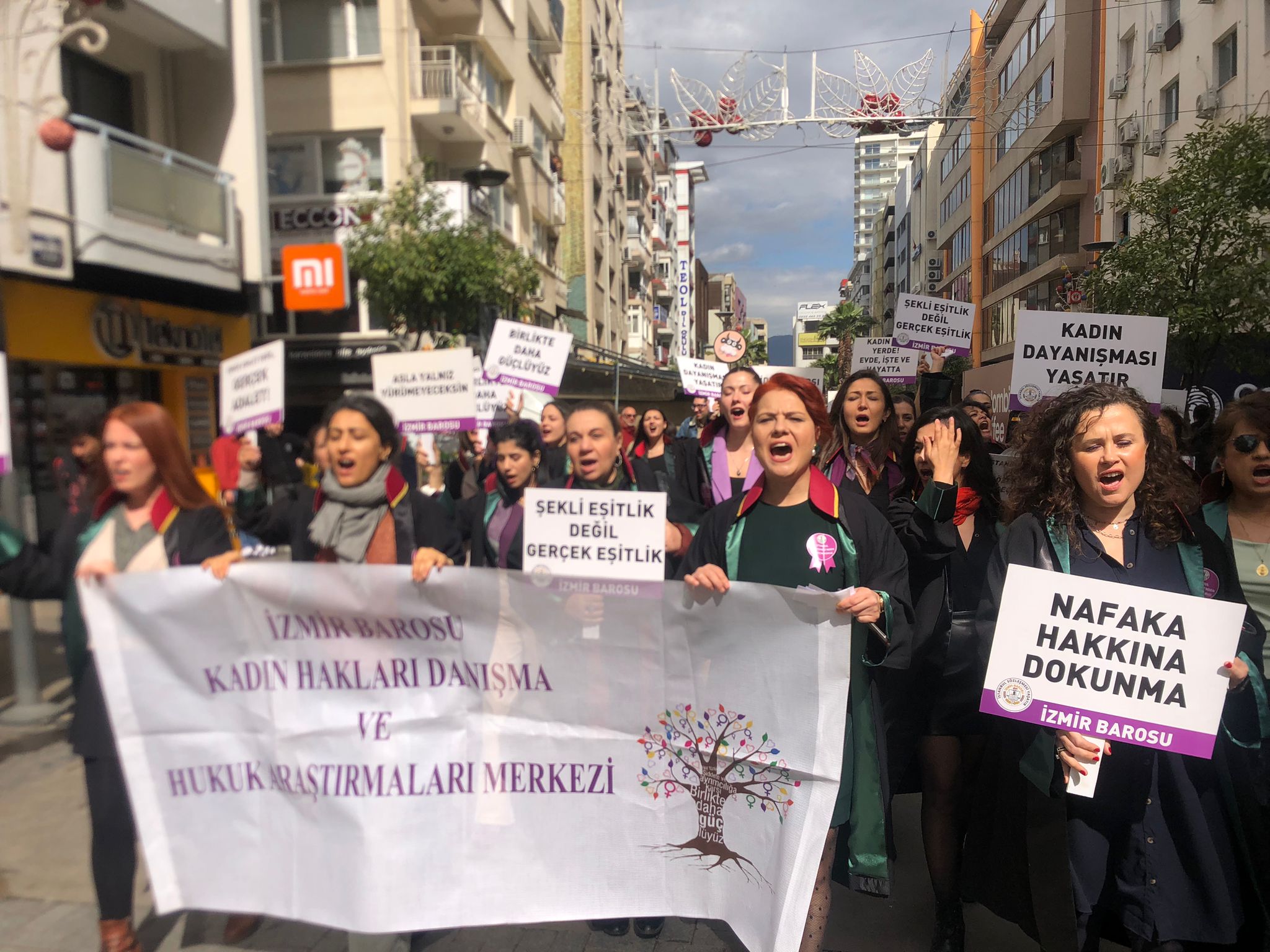 YELİZ AKPINAR/ İZMİR GÜNDEMİ- İzmir Barosu Kadın Hakları Dayanışma ve Hukuk Araştırmaları Merkezi üyeleri 8 Mart Dünya Kadınlar Günü için İzmir Baro Binası önünden ‘Susmuyoruz, korkmuyoruz itaat etmiyoruz’ sloganlarıyla Alsancak Türkan Saylan Kültür Merkezi önüne yürüdüler. Basın açıklamasını İzmir Barosu Kadın Hakları Dayanışma ve Hukuk Araştırmaları Merkezi adına yürütme kurulu üyeleri olan Av. Büşra Marangozoğlu ve Av. Gözde Önal yaptı.