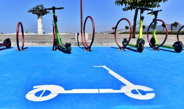 İzmir Büyükşehir Belediyesi tüm dünyada sürdürülebilir ve çevreci bir ulaşım aracı olarak hızla yaygınlaşan elektrikli skuter (e-skuterler) için park alanları oluşturdu.Çalışmalar kapsamında Üçkuyular İskelesi ile Mavişehir arasındaki yaklaşık 20 kilometrelik sahil şeridi üzerinde BİSİM, tramvay istasyonu, vapur iskelesi ile entegre olacak şekilde 47 noktada toplam 668 adet e-skuter park yerinin yapımı tamamlandı. İzmir’in iç kesimlerinde ise 16 noktada toplam 151 adet e-skuter park yerinin yapımı devam ediyor. Bu 16 noktadan beşinde toplam 44 adet e-skuter park yerinin yapımı tamamlandı. 11 noktada ise imalatlar devam ediyor. Ulaşım Dairesi Başkanlığı tarafından koordine edilen çalışma tamamlandığında İzmir toplam 63 noktada 2 bin 457 kapasiteli e-skuter park alanına sahip olacak.Şikayetler üzerine skuter firmalarıyla toplantıHatalı park etme türleriyle ilgili olarak İzmir Büyükşehir Belediyesi’ne gelen şikayetler doğrultusunda İzmir’de faaliyet gösteren 9 e-skuter operatörünün yetkilileriyle toplantı yapıldı. Toplantıda, İzmir Büyükşehir Belediyesi’nin hazırladığı güncel coğrafi park sınırlamaları, kaldırım işgallerinin önlenmesi, yeni park yeri çözümleri, skuter kullanımında güvenlik, sürdürülebilir veri toplama sistemi ile ilgili konular ele alındı.