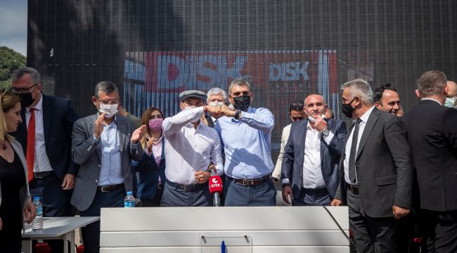 Büyükşehir Belediyesi şirketi İZELMAN ile DİSK Genel-İş Sendikası arasında uzlaşma ile sonuçlanan toplu iş sözleşmesinin imza töreni, erken 1 Mayıs kutlamasına sahne oldu. 7 bin personeli ilgilendiren ve tüm taban ücretlere yüzde 21 oranında zam öngören sözleşmenin imza töreninde işçiler, Büyükşehir Belediye Başkanı Tunç Soyer’e sevgi gösterilerinde bulundu. Kültürpark'taki imza törenine İzmir Büyükşehir Belediye Başkanı Tunç Soyer, CHP Grup Başkan Vekili Özgür Özel, CHP İzmir Milletvekili Murat Bakan, CHP İzmir Milletvekili Sevda Erdan Kılıç, CHP İzmir Milletvekili Ednan Arslan, CHP PM Üyesi Rıfat Nalbantoğlu ile Devrim Barış Çelik, DİSK Genel-İş Genel Başkanı Remzi Çalışkan, İzmir Büyükşehir Belediye Başkan Vekili Mustafa Özuslu, İzmir Büyükşehir Belediyesi Genel Sekreteri Dr. Buğra Gökçe, Konak Belediye Başkanı Abdül Batur, Dikili Belediye Başkanı Adil Kırgöz, CHP İzmir İl Başkanı Deniz Yücel, CHP Konak İlçe Başkanı Çağrı Gruşçu, sendika başkanları ile temsilcileri katıldı.