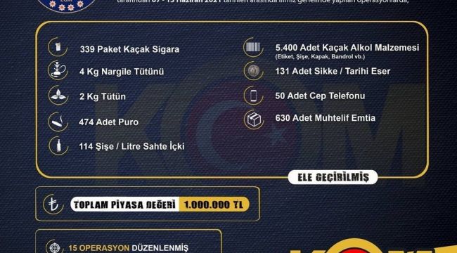İzmir İl Emniyet Müdürlüğü Kaçakçılık Suçlarıyla Mücadele Şube Müdürlüğü ekipleri, kent genelinde 7-13 Haziran tarihleri arasında 15 operasyon gerçekleştirdi. Düzenlenen operasyonlarda; 339 paket kaçak sigara, 4 kilogram nargile tütünü, 2 kilogram tütün, 474 puro, 114 şişe-litre sahte içki, 5 bin 400 kaçak alkol malzemesi, 131 sikke-tarihi eser, 50 cep telefonu, 630 muhtelif emtia ele geçirildi.