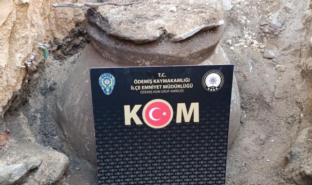 Ödemiş İlçe Emniyet Müdürlüğü Kaçakçılık ve Organize Suçlarla Mücadele (KOM) Grup Amirliği ekipleri, Cumhuriyet Mahallesi Gümüşsuyu mevkisinde bulunan bir çay bahçesi önündeki arazide çalışmalar gerçekleştirdi. Yapılan çalışmalarda tarihi eser niteliği taşıdığı değerlendirilen ve çeşitli dönemlere ait 19 parça kırık seramik parçaları, yaklaşık bir metre çapında eski zahire küpü ile yassı biçimde yaklaşık 20 santim kalınlığında taş çıkarıldı.