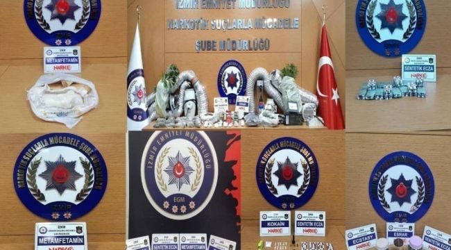 İzmir İl Emniyet Müdürlüğü Narkotik Suçlarla Mücadele Şube Müdürlüğü ekipleri, 8-14 Mart tarihleri arasında kent genelinde 38 operasyona imza attı. Operasyonlarda; 1 kilogram 665 gram esrar, 1 kilogram 247 gram metamfetamin, 21 gram kokain, 2 gram eroin, 4 kök kenevir, 785 gram sentetik kannabinoid, 47 adet extacy, 4 bin 498 adet sentetik ecza, 840 TL nakit para, 1 adet tabanca, 2 adet tüfek, 1 adet şarjör ve 15 adet fişek ele geçirildi.