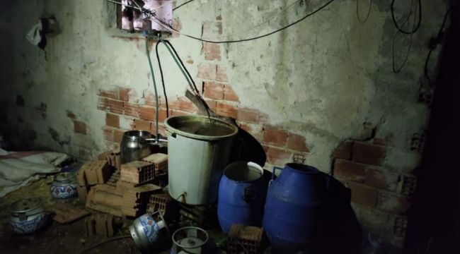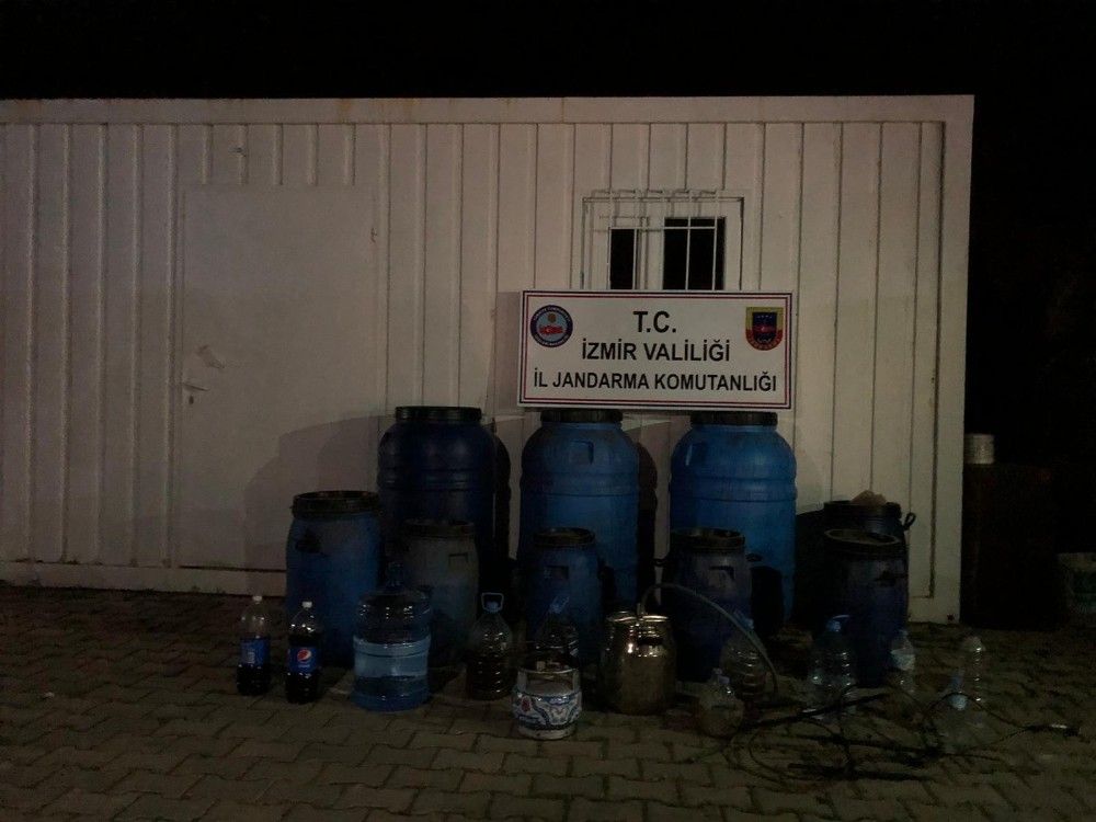 İl Jandarma Komutanlığı KOM Şube Müdürlüğü ve Seferihisar İlçe Jandarma Komutanlığı ekipleri, ilçeye bağlı Beyler Mahallesi'nde ikamet eden bir şahsın, evinde alkollü içki üreterek piyasaya sürdüğü bilgisi üzerine çalışma başlattı.