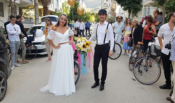 Tire’de yaşayan bisiklet tutkunu Çiğdem Kavasoğlu ile Erdem Can, evlenme kararı aldı. En özel günlerini unutulmaz kılmayı planlayan çift, nikah salonuna otomobil yerine bisikletle gitti. Genç çifte arkadaşları da bisikletleriyle eşlik edince ortaya renkli görüntüler çıktı. Tandem bisikletle yola çıkan genç çift onlarca bisikletli arkadaşıyla birlikte nikah salonuna kadar pedal çevirdi.Bisikletli gelin konvoyunu görenler ise şaşkınlıklarını gizleyemedi. Genç çift, yaptıkları açıklamada, “Bugüne kadar bisikletle sportif faaliyetler ve kültürel etkinlikler başta olmak üzere bir çok farklı etkinlikler yaptık. Bisikletin insan yaşamındaki yerini vurgulamak adına çok sayıda etkinlik düzenledik. düğün konvoyu da neden bisikletle yapılmasın dedik. Bisikletli düğün konvoyunun araçlarla yapılandan çok daha şık olacağını düşündük. Konvoyumuz çok güzel oldu. Katılan tüm arkadaşlarımıza teşekkür ediyoruz” dedi.