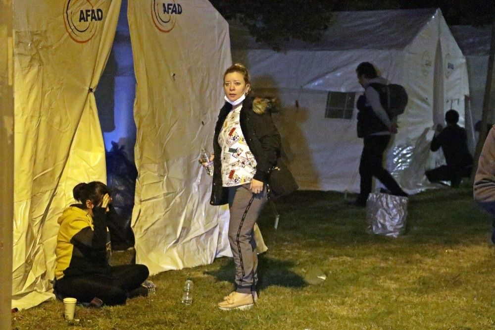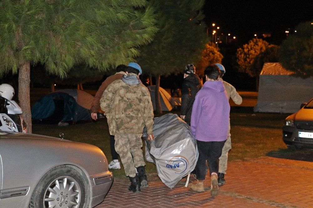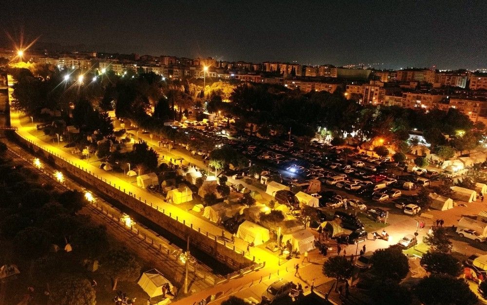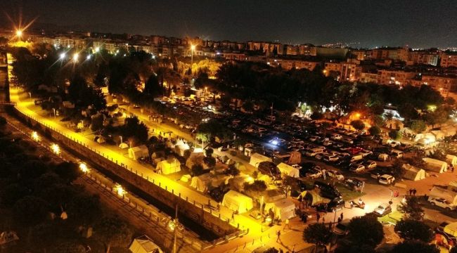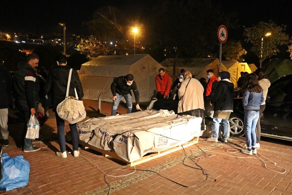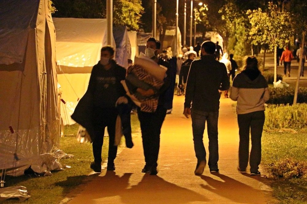 İzmir'in Seferihisar ilçesi açıklarında dün saat 14.51'de Ege Denizi'nde 6,6 büyüklüğünde meydana gelen depremin ardından, binaları hasarlanan ve evlerine girmekte tedirginlik yaşayan vatandaşlar için Bornova ilçesindeki Aşık Veysel Rekreasyon Alanı'na AFAD, İzmir Büyükşehir Belediyesi, çevre ilçelerin belediyeleri ve STK'lar tarafından çadır kurulmaya devam ediliyor. Şuana kadar yüzlerce çadırın kurulduğu bölgede, dışarıda kalan vatandaşların geceyi rahat geçirebilmeleri için AFAD, belediye ekipler, STK'lar, polis, jandarma ve esnaflar adeta seferberlik içerisinde. Vatandaşlara, soğuktan etkilenmemeleri için ekipler tarafından battaniye, sıcak çorba ve gıda yardımı yapılıyor. Çalışmalara ilçedeki esnaflar da yiyecek ve içecek konusunda ücretsiz destek veriyor.