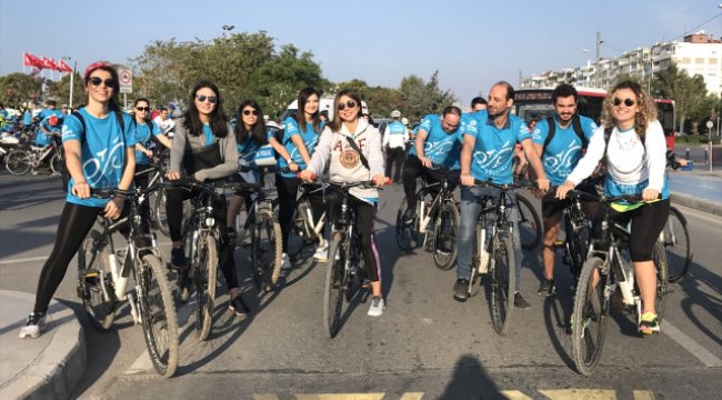 Ege Çağdaş Eğitim Vakfı'nın (EÇEV) eğitime katkı sağlamak ve bisiklet kullanımını yaygınlaştırmak amacı ile düzenlediği 'Eğitime Pedalla' etkinliği gönüllülerin katılımıyla gerçekleştirildi.Yaklaşık 350 bisikletli gönüllü Bostanlı Vapur İskelesinde buluştu. Tur öncesinde kayıt yaptıran ve bağışta bulunan gönüllüler adına konuşan EÇEV Kaynak Geliştirme Koordinatörü Fatih Mehmet Akdan, ilk defa düzenledikleri ücretli etkinliğe yoğun katılımından çok memnun olduklarını belirtti.İzmir'deki bisiklet farkındalığını ve kullanımını arttırmak, eğitime katkı sağlamak için bu etkinliği düzenlediklerini ifade eden Akdan, 'Bostanlı'da başlayıp İnciraltı'nda bitireceğiz. Kayıt yaptırıp gelmeyecek olanlar da oluyor. Bağış etkinliği olduğu için anneannesini bile kayıt yaptıranı gördüm. Maksat bağış toplamak. Gelmese bile en azından kayıt yaptırıyor. Bağış kampanyalarımız 28 Ekim'e kadar devam edecek.' diye konuştu.Çevre ve eğitim için pedal çevirmeye gelen Gürkan Keser, tura kızıyla katıldığını belirterek, 'Çevreye faydalı olsun, daha az egzoz dumanı olsun eğitime destek olmak amaçlı bir kampanya başlatıldı. Fırsat eşitsizliği olan bölgelerdeki çocuklara burs olarak fayda sağlayabilme adına vakıfla birlikte bir tur yapmayı planladık.' ifadelerini kullandı.Katılımcılardan Mustafa Özaydın ise, şöyle konuştu: 'Trafikte bisiklet kullanımı ve farkındalığı yaratmak amacımız. 'Bedenimiz kaportamız' bütün araç sahiplerine bunu belirtmek istiyorum. Zaman zaman otobüs şoförleri, dolmuş şoförleri ve sivil araç kullanan arkadaşlar yeri geliyor bizi sıkıştırıyorlar, bilinçli ya da bilinçsiz. Bunlara dikkat edilmesini özenle rica ediyorum.'