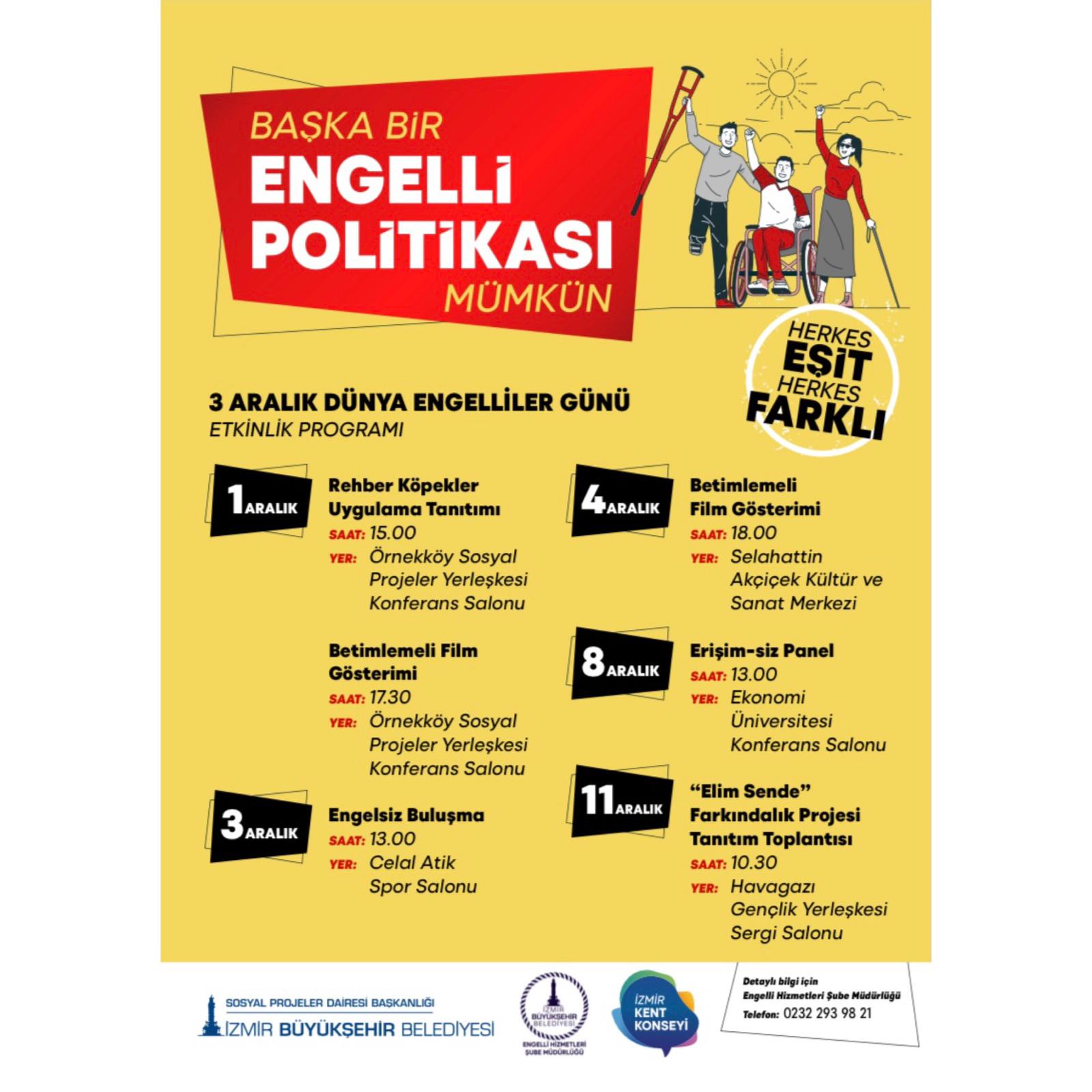 İzmir Büyükşehir Belediyesi, “3 Aralık Dünya Engelliler Farkındalık Günü” kapsamında 1-11 Aralık tarihleri arasında farkındalık etkinlikleri düzenliyor. Engelsizmir hedefini “Başka Bir Engelli Politikası Mümkün” anlayışıyla güçlendiren İzmir Büyükşehir Belediye Başkanı Tunç Soyer’in vizyonu doğrultusunda Sosyal Projeler Dairesi Başkanlığı’na bağlı Engelli Hizmetleri Şube Müdürlüğü tarafından spordan sanata, konserden panele kadar bir dizi etkinlikle engelli farkındalığı kente yayılacak.
