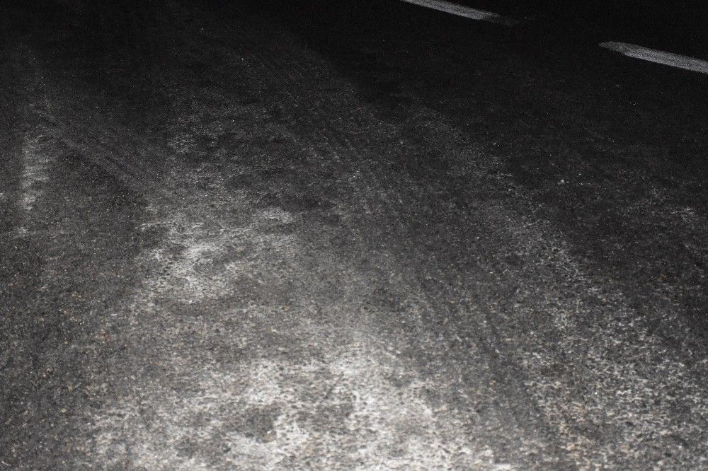 Trafik polislerinin güvenlik önlemi aldığı yoldaki sıvı madde Karayolları ekiplerince kumlandı.