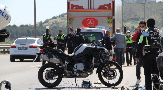 İzmir'de meydana gelen trafik kazasında, kamyona arkadan çarpan görevli motosikletli trafik polisi ağır yaralandı.