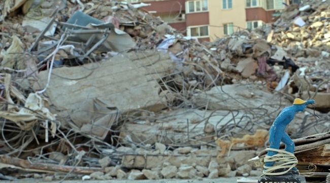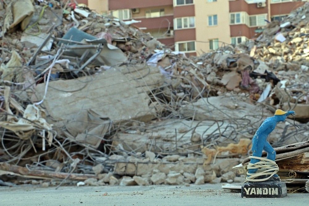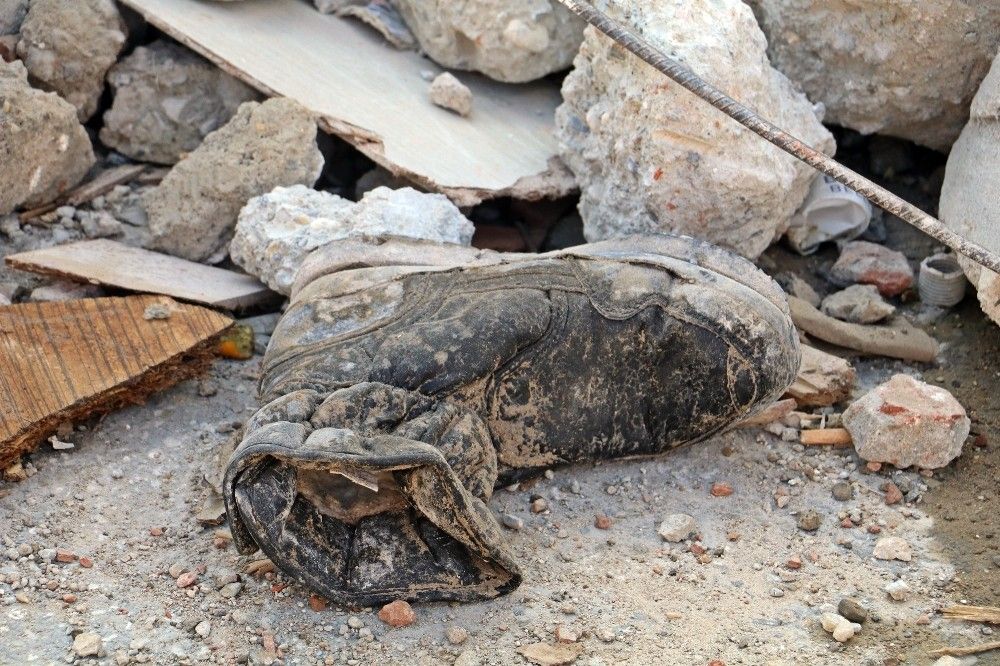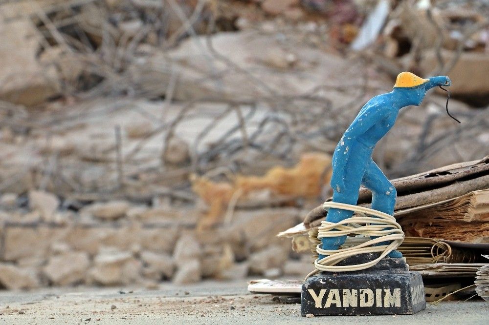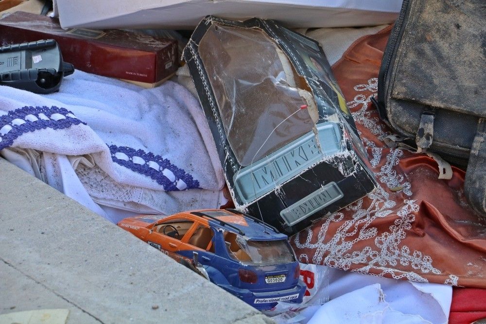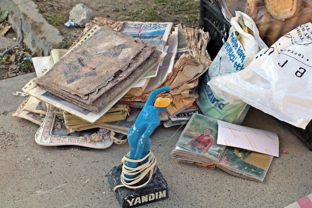 Depremde ya da hasarlı olduğu için yıkılan binalardan vatandaşlara ait çıkan özel eşyalar, ekipler tarafından tespit edilerek bina enkazlarına yakın bölgelerde toplanıyor. Aralarında fotoğraf albümleri, henüz kutusundan yeni çıkartılmış oyuncak araba, kitap gibi eşyaların bulunduğu bir apartman enkazının önündeki 'yandım' yazılı gece lambası ise her şeyi özetliyor.