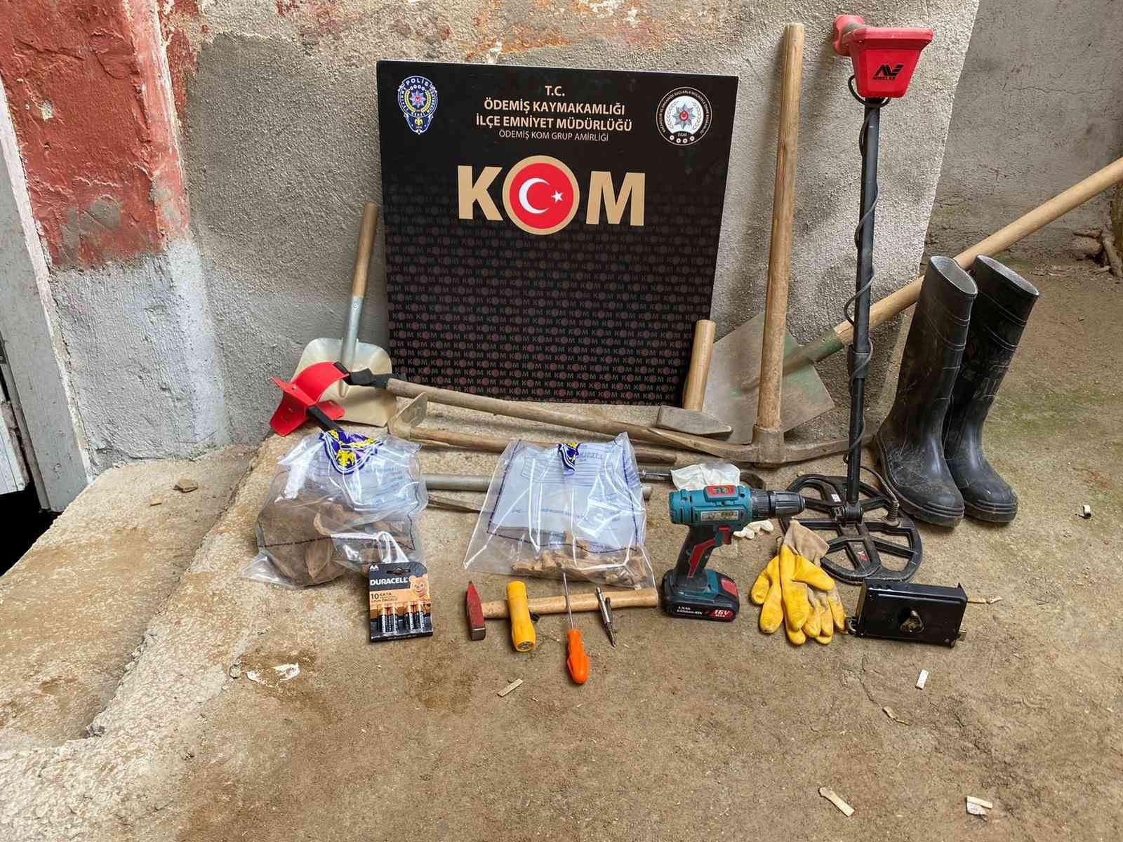 Ödemiş İlçe Emniyet Müdürlüğü Kaçakçılık ve Organize Suçlarla Mücadele (KOM) Grup Amirliği ekipleri, İnönü Mahallesi'nde bir evde kaçak kazı yapıldığına yönelik bilgi edindi. Bunun üzerine harekete geçen ekipler, adrese düzenlendikleri baskında 2 kadın ve 1 erkek şahsın kazı yaptıklarını tespit etti. Ekiplerce kazı bölgesinde yapılan aramalarda; 12 adet testi parçaları, 8 adet kemik parçaları, 2 adet kürek, 1 adet dedektör ve parçaları, 1 adet matkap ve parçaları, 1 adet kazma, 1 adet çapa ve çok sayıda kazı çalışmasında kullanılan malzemelere el konuldu.