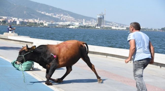 Tepecik Mahallesi'ndeki kurban kesim pazarında kesilmek üzereyken kasabın elinden kaçan boğa, ortalığı birbirine kattı. Güleser Kocaman (60), Kurban Bayramı öncesi 7 bin 500 TL'ye satın aldığı boğanın yakalanması için İzmir Büyükşehir Belediyesi Mezbahalar Şube Müdürlüğü ekiplerinden yardım istedi. Veteriner hekim ile Güleser Kocaman, boğanın peşine düştü. Tepecik'ten Güzelyalı sahiline kadar sahibini ve veterineri peşinden koşturan boğaya, iki sakinleştirici iğne atıldı. İğnenin etkisi kendini gösterene kadar kaçmayı sürdüren boğa, sahilde yere yığıldı. Yaklaşık 8 kilometre boyunca sahibini ve veterineri peşinden koşturan boğanın gözlerini bağla için nakliye aracı çağırıldı. Boğa, çevre sakinlerinin yardımıyla nakliye aracına kadar getirildi. Güçlükle araca konan boğa, mezbahaya götürüldü.