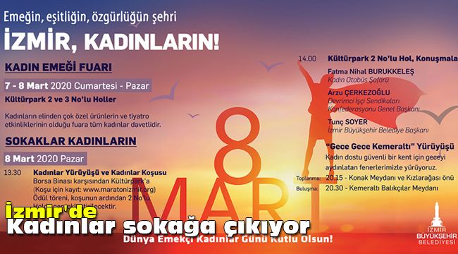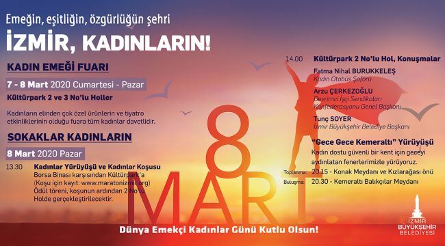 İzmir, 8 Mart Dünya Emekçi kadınlar Günü kapsamında 7-8 Mart 2020 tarihleri arasında “Kadın Emeği Fuarı” ve “Sokaklar Kadınların” etkinliklerine ev sahipliği yapacak. 7-8 Mart tarihleri arasında Kültürpark 2 ve 3 No’lu hollerde iki gün açık kalacak fuarda 550 stantta kadınların el emeği ürünleri sergilenecek. Fuarda karakılçık buğdayının bulgur taşında öğütülmesi, sabun ve mum yapımı, ham keçe çalışmaları, ipek kozasından çiçek yapımı, deri işleme atölyesi, dikiş, çini, kabak oyma ve geri dönüşüm gibi başlıklarda pek çok atölye çalışması da yapılacak. Fuar boyunca tiyatro topluluklarının kısa oyunları da sergilenecek. Kadınlar Günü etkinlikleri kapsamında çevre ilçelerde de film gösterimleri yapılacak.