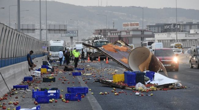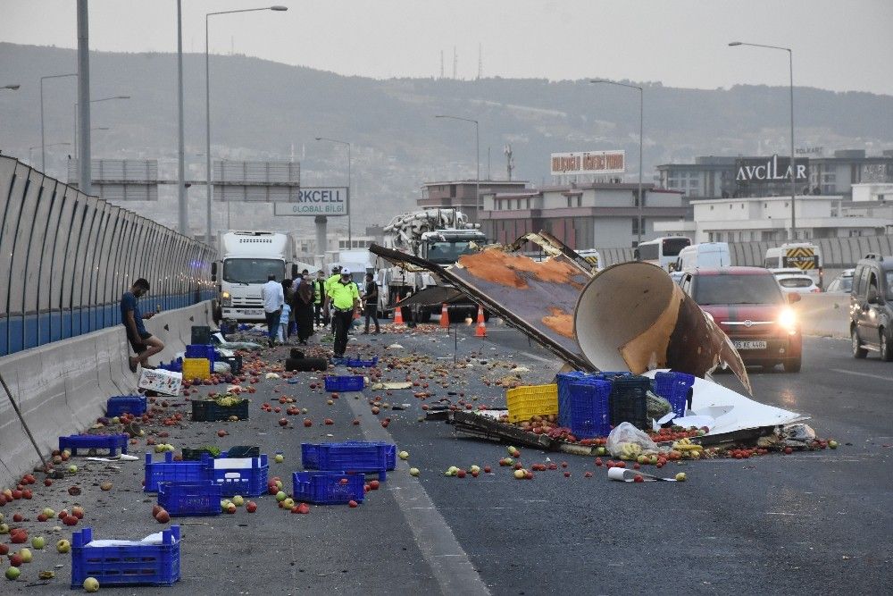 Öte yandan kaza yapan 35 TNG 77 plakalı kamyonette bulunan meyve ve sebzeler otoyola saçıldı. Kazayı gören diğer araç sürücüleri, durumu sağlık ve polis ekiplerine ihbar etti. İhbar üzerine kaza yerine gelen otoyol polisleri, çevre güvenliğini sağladı. Kazada yaralanan Baran K. isimli sürücü, sağlık ekiplerinin yaptığı ilk müdahalenin ardından Ege Üniversitesi Tıp Fakültesi Hastanesi'ne kaldırıldı. Öte yandan, yola saçılan metal parçaları, meyve ve sebzeler karayolları ekiplerinin yaptığı çalışmalar ile temizlendi. Kaza nedeniyle otoyolda, Bornova yönünden Karşıyaka istikametinde trafik yoğunluğu yaşandı.
