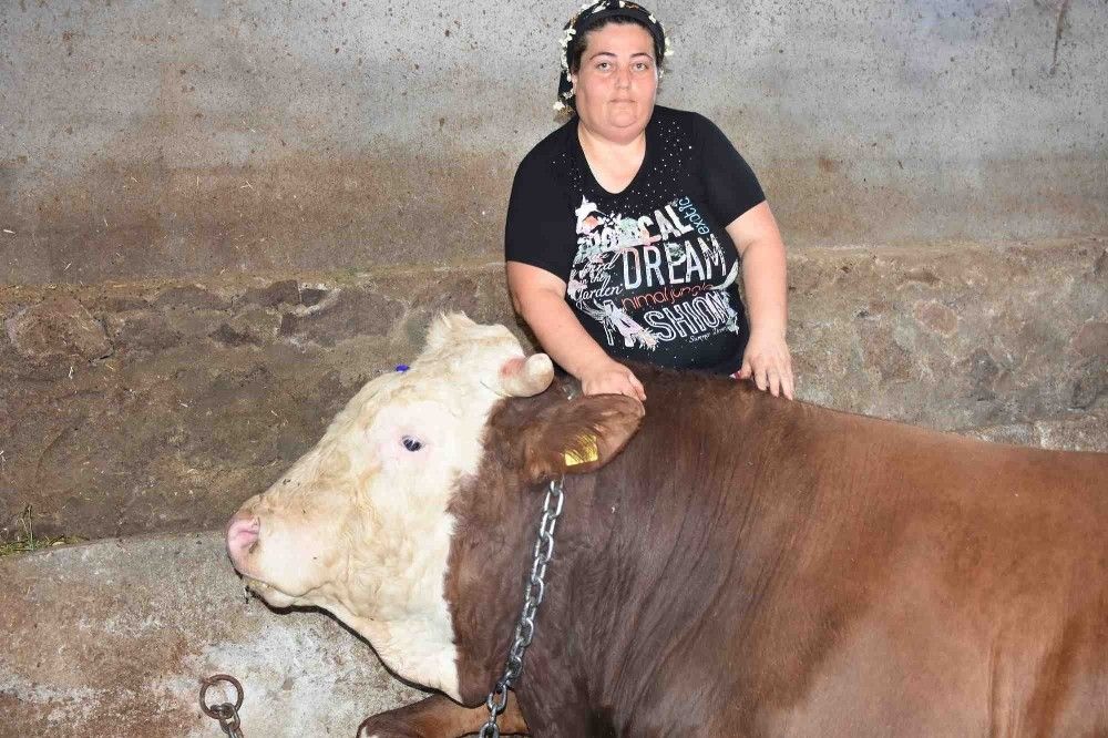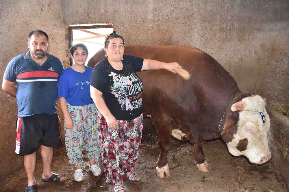 Evlatlarından ayırmadan boğayı besleyip büyüttüğünü anlatan Ayşe Zeybek, "3 aylıkken satın aldık. Küçük olduğu için sütle bir süre besledim ve sonrasında buzağı yemi vermeye başladım. Kınalı kuzumla yanına geldiğimde konuşuyorum, muhabbet ediyorum. Bakımını 2.5 yaşına kadar ben yaptım, besledim, büyüttüm. Kurbanda satmaya karar verdik, çünkü kapılardan geçemeyecek duruma geldi. Yaklaşık 1 ay önce tarttığımızda bin 400 kilo gelmişti. Kurban Bayramı'nda boğamıza 30 bin TL fiyat biçtik. Allah nasip ederse satacağız" dedi.