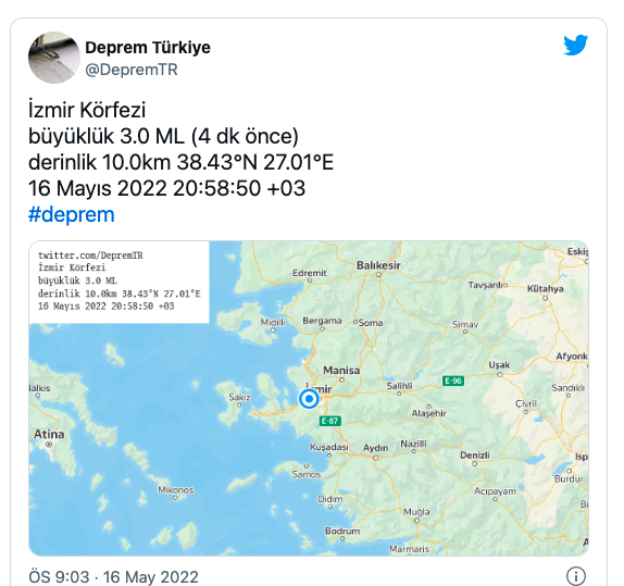 Gündem 16 Mayıs 2022 - 21:21 Güncelleme: 16 Mayıs 2022 - 21:23 İzmir'de korkutan deprem! Gündem 16 Mayıs 2022 - 21:21 Güncelleme: 16 Mayıs 2022 - 21:23 Yorumlar TAKİP ET Dinle Yazdır A Büyüt A Küçült Yorumlar İzmir Körfezi'nde deprem meydana geldi. Çoğu vatandaş tarafından hissedilen depremin büyüklüğü 3.0 olarak belirtildi. YORUMLAR adlı kullanıcıya cevap x Gönder İlginizi Çekebilir İZBETON soruşturmasında villa detayı! Şikayet dilekçesi ortaya çıktı Bornova Belediye Başkanı Eşki'nin serbest bırakılmasına savcılıktan itiraz Başkan Eşki'nin ifadesi ortaya çıktı! Mahkemeden Meslek Fabrikası için kritik karar: Delil tespiti kısmen kabul edildi, Cemil Tugay fabrikaya girdi Son Haberler Başkan Tugay, “Bu şehrin başını öne eğdirmeyeceğiz” Karşıyaka’da bayram coşkusu sahalarda yaşanacak CHP'li Güç, Büyükşehir Meclisi'nde yaşananlar 'Vandalizmdir!' Büyükşehirden Uzundere açıklaması:'Çalışmalar hızla sürüyor' İzmir Kitap Fuarı’nda Ortaylı'nın ailesi okurlarla bir araya geldi Benzine ve LPG'ye bir zam daha geliyor! Benzine ve LPG'ye bir zam daha geliyor!