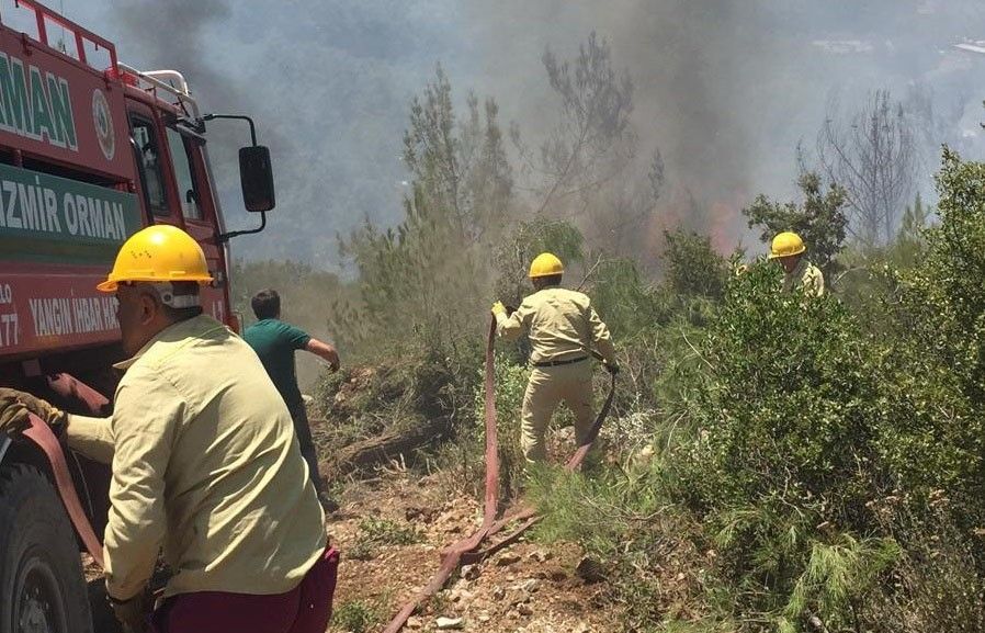 İzmir orman Bölge Müdürlüğü tarafından 2 helikopter ve 5 arazöz ile müdahale edilen yangın ekiplerin çalışması sonucu kontrol altına alındı. Bölgede soğutma çalışmalarının sürdüğü bildirildi.