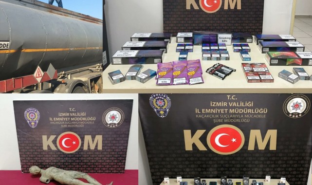 İzmir İl Emniyet Müdürlüğü kaçakçılık Suçlarıyla Mücadele Şube Müdürlüğü ekipleri, kent genelinde 2 - 8 Ağustos tarihleri arasında 18 ayrı operasyon gerçekleştirdi. Operasyonlar kapsamında adreslerde yapılan aramalarda 100 bin 200 adet doldurulmuş makaron, 14 milyon 780 bin adet makaron, bin 746 paket kaçak sigara, 11 kilogram tütün, bin 280 adet puro, 16 şişe ve 30 litre sahte içki, 2 bin 720 litre etil alkol, 2 bin 27 adet sahte içki etiketi, 38 adet sikke, 6 adet tarihi eser, 8 adet cep telefonu, 2 bin 900 litre kaçak akaryakıt ve 41 adet elektronik emtia ürünü ele geçirildi. Ele geçirilen ürünlerin piyasa değerinin 2 milyon lira olduğu bildirildi.