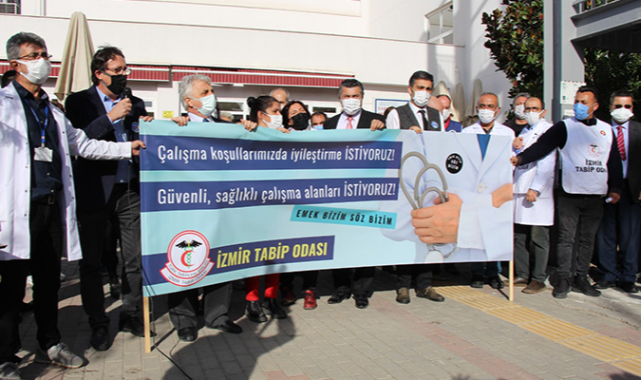 "ÇALIŞMA KOŞULLARI KÖTÜ HALE GELDİ"Basın açıklamasını ise İzmir Tabip Odası Başkanı Lütfi Çamlı yaptı. Pandemi sürecinde geride kalan 19 ayda en çok sağlık emekçilerin olumsuz etkilendiğini belirten Çamlı açıklamasında şunları kaydetti:"İktidarın sağlık emekçilerini ve toplumu yok sayan anlayışı nedeniyle önlenebilir bir hastalıktan yüzlerce arkadaşımızı kaybettik. Tüm pandemi süreci boyunca hekimler ve sağlık çalışanları uygun olmayan çalışma koşullarında uzun süre çalışmak zorunda kaldı. Sağlık Bakanlığı başta olmak üzere, iktidarın bilimsel bilgiye dayanmayan, şeffaflıktan uzak, yerel dinamikleri gözetmeyen, eksik, yanlış ve tutarsız uygulamalarının bedelini biz sağlıkçılar hayatlarımızla ödedik, ödüyoruz. Uzun saatler kesintisiz çalışma, sık nöbet tutma, her 5 dakikada bir muayene, yoğun iş yükü, şiddete maruz kalma çalışma alanımız olan sağlık kurumlarının olağanı haline geldi. Pandemi öncesinde de karşı karşıya kaldığımız bu sorunlar salgınla birlikte daha da derinleşti, çalışma koşullarımız daha kötü hale geldi."