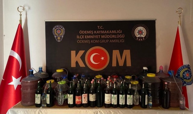 Ödemiş İlçe Emniyet Müdürlüğü kaçakçılık ve Organize Suçlarla Mücadele (KOM) Grup Amirliği ekipleri, ilçede bulunan bir adreste sahte içki bulundurulduğu bilgisi üzerine çalışma başlattı. Operasyonda polis ekipleri tarafından adreste yapılan aramada, 235,5 litre sahte şarap, bin 410 mililitre sahte rakı ve 16 adet boş şişe ele geçirildi.